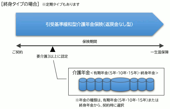 介護年金のタイプは、有期年金(5年・10年・15年)、終身年金の中から選択できます。