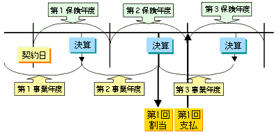 つまり、これは翌々事業年度の契約応当日に第3保険年度を迎える契約となるため、3年目配当と呼ばれています。