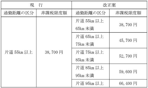 通勤距離が片道65km以上の者の1月当たりの非課税限度額が次のように引き上げられます。 |