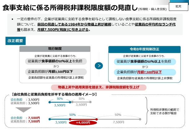 使用者からの食事の支給により受ける経済的利益について所得税が非課税とされるその食事の支給に係る使用者の負担額の上限が月額7,500円(現行:月額3,500円)に引き上げられます。 |