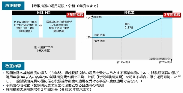 試験研究費の額が平均売上金額の10%を超える場合における税額控除率の特例及び控除税額の上限の上乗せ特例の適用期限が3年延長されます。 |