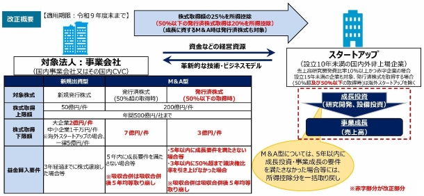 今回、事業会社とスタートアップの協業の更なる促進やスタートアップの出口戦略の多様化を後押しする観点から、M&A型について、マイノリティ取引(3年以内に議決権の過半数を超えることが見込まれる、50%以下の発行済株式取得)が制度の対象となります。また、吸収合併時には、一括での益金算入から5年間での均等額の取り崩しに見直しが行われます。その上で、本税制の適用下限額を引き上げ、適用期限が2年間延長されます。