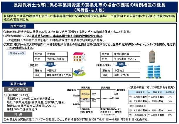 この「長期保有土地等に係る事業用資産の買換え等の場合の課税の特例」について、対象となる買換資産の一部を見直した上で、適用期限が令和11年3月31日まで延長されます。