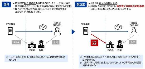 国境を越えて行われる通信販売のうち、輸入時の消費税等が原則免税となる1万円以下の商品については、諸外国や国内取引と同様、販売者に消費税の納税義務を課すこととされます。