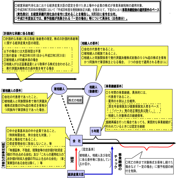 ここで、経営承継相続人とは、中小企業における経営の承継の円滑化に関する法律の規定に基づき経済産業大臣の認定を受けた一定の非上場会社の後継者をいいます。また、経営承継相続人は、経済産業大臣の認定の有効期間である5年間は毎年、その後は3年ごとに継続届出書を税務署に提出しなければなりません。 この新しい事業承継税制である「取引相場のない株式等に係る相続税の納税猶予制度」と「経営承継円滑化法」との関係をまとめたものが以下となります。 ![]() (経済産業省資料より)