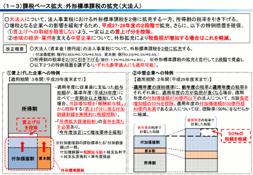 大法人について、法人事業税における外形標準課税を2倍に拡充する一方、所得割の税率を引き下げる。増税となる企業への影響を緩和するため、平成27・28年度の2段階で拡充。さらに、以下の特例措置を確保。