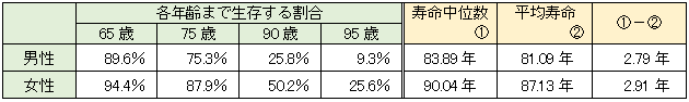 生命表上の特定年齢まで生存する割合、寿命中位数と平均寿命の比較