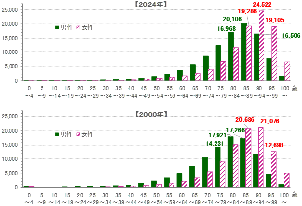 2020年以降延びが止まっているように見える平均寿命ですが、終戦直後からそれまでほぼ一貫して延伸を続けてきました。つまり、年を追うごとに死亡年齢の分布が後ろにずれてきたわけで、約四半世紀前(図表2の下段)と比較すると一目瞭然です。男性の場合、ピークが2000年の“80~84歳”から2024には“85~89歳”に移るとともに、グラフの高さが増しました。女性は2000年の時点から“90~94歳”が最多でしたが、その上の“95~99歳”に大幅に移っているにも関わらず、“90~94歳”は高さが大きく増しています。死亡年齢が70・80歳代から90歳代に明らかにシフトしています。