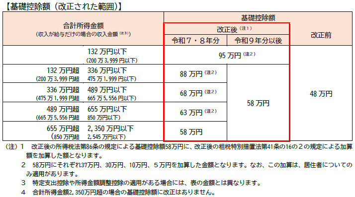 次のとおり、合計所得金額に応じて、基礎控除額が改正された。