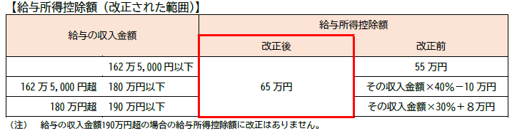 給与所得控除について、55万円の最低保障額が65万円に引き上げられた。