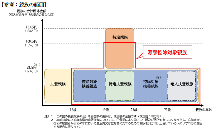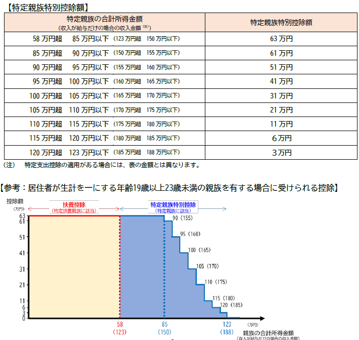 特定親族とは、居住者と生計を一にする年齢19歳以上23歳未満の親族(配偶者、青色事業専従者として給与の支払を受ける人及び白色事業専従者を除く、以下同じ)で合計所得金額が58万円超123万円以下の人をいう。