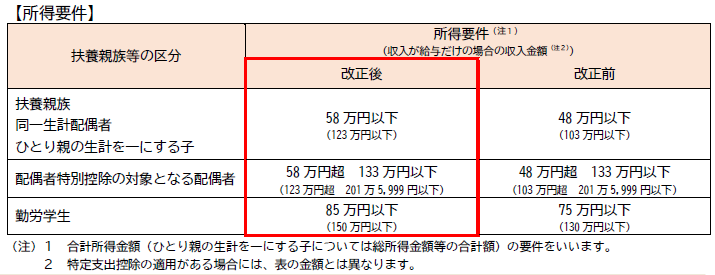 上記(1)の基礎控除の改正に伴い、次の表のとおり、扶養控除等の対象となる扶養親族等の所得要件が改正された。