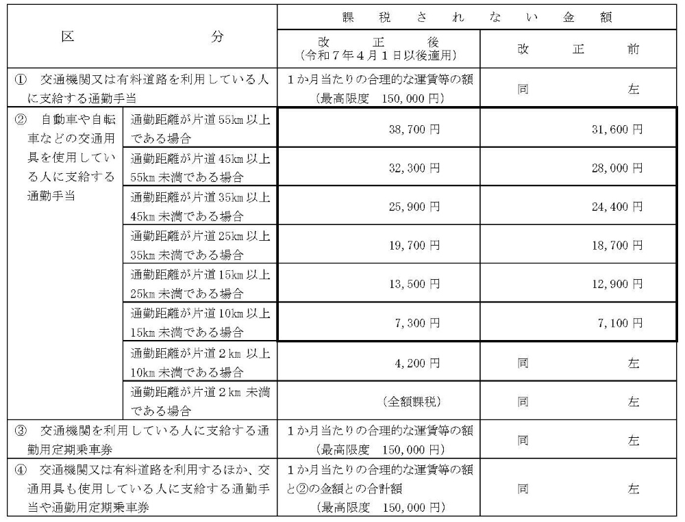 令和7年11月19日に所得税法施行令の一部を改正する政令が公布され、通勤のため自動車などの交通用具を使用している給与所得者に支給する通勤手当の非課税限度が引き上げられた。この改正は、令和7年11月20日に施行され、令和7年4月1日以後に支払われるべき通勤手当(同日前に支払われるべき通勤手当の差額として追加支給するものを除く)について適用される。