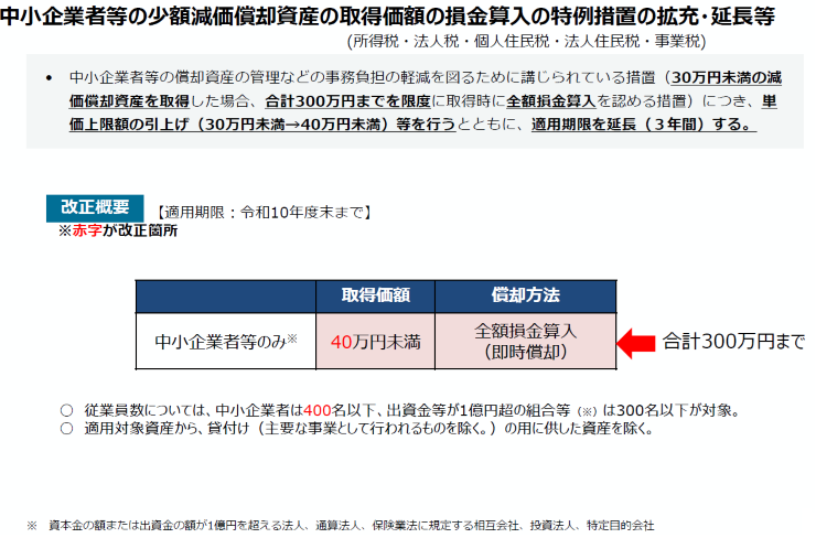 中小企業者等の減価償却資産に係る事務負担の軽減を図る観点から、中小企業者等が少額減価償却資産を取得した場合、取得時に取得価額の全額を損金算入可能とする特例が、現在設けられている。令和8年度税制改正大綱において、制度が創設された平成15年度以降の主要な対象資産の価格動向等を踏まえ、30万円未満となっている取得価額の基準を40万円未満に引き上げる等の見直しを行った上で、期限を3年延長するとしている。
