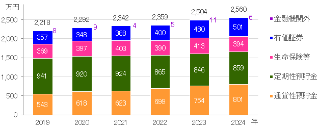 2024年の総額は2,560万円で、近年少しずつ増えてきたことがわかります。総額の3分の2近く(64.8%)を預貯金が占めています。有価証券は2割程度(19.6%)にすぎませんが、2019年に比べると3.5ポイント高く、緩やかな上昇傾向にあると言えます。皆さんご自身のポートフォリオと比べてみてください。
