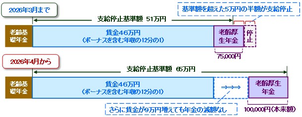 基本月額(老齢厚生年金額)10万円、総報酬月額相当額(賃金)46万円(標準報酬月額36万円、標準賞与額120万円<月額10万円>)の場合