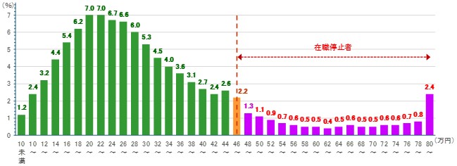 図2は、2024年11月の同部会に提出された資料です。65歳以上で在職している年金受給権者の賃金(総報酬月額相当額)と厚生年金の合計額の分布(在老の支給停止基準額が47万円だった2022年度末時点)です。2万円刻みで、基準額の47万円は「46万円以上48万円未満」(オレンジ色)の中間にあたりますので、境界線前後の部分の割合ははっきりしません。しかし、すぐ下の「44万円以上46万円未満」がその前後に比べて相対的に高いことから、年金の支給停止を嫌って基準額以下に収まるように就労を抑制している人が一定数いたことが想像されます。