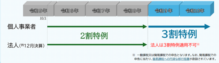 今般の令和8年度税制改正により、インボイス発行事業者の登録を受けたことにより免税事業者から課税事業者となった個人事業者に係る令和9年分・令和10年分の消費税の確定申告において納付税額を売上げに係る消費税額の3割とすることができる特例が設けられた。なお、法人については対象外となり、一般課税か簡易課税を選択することになる。
