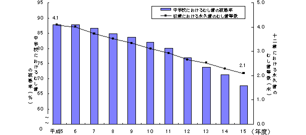 厚生労働省公表の「平成11年 保険福祉動向調査の概況」でも、昭和44年当時、歯を磨く回数が1日1回の人は62.79%、2回が15.11%、3回にいたってはわずか1.77%だったのが、平成11年の調査ではそれぞれ、29.04%、48.10%、19.02%と磨く回数が格段に増えているのがわかる。 歯に対する健康・美容意識は世代を問わず80年代以降急速に高まっているようだ。 【中学校におけるむし歯の被患率の推移】